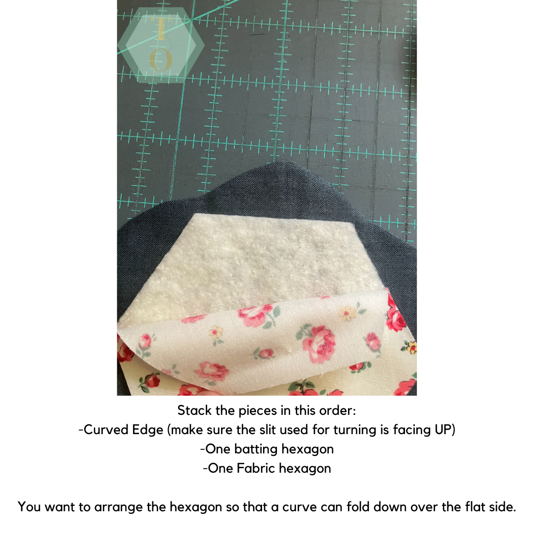 Supplies needed for one block: Templates + One 5” square of center fabric, One 5” square of batting, Two 8” squares of the curved edge fabric, thread matching the curved edge fabric*.