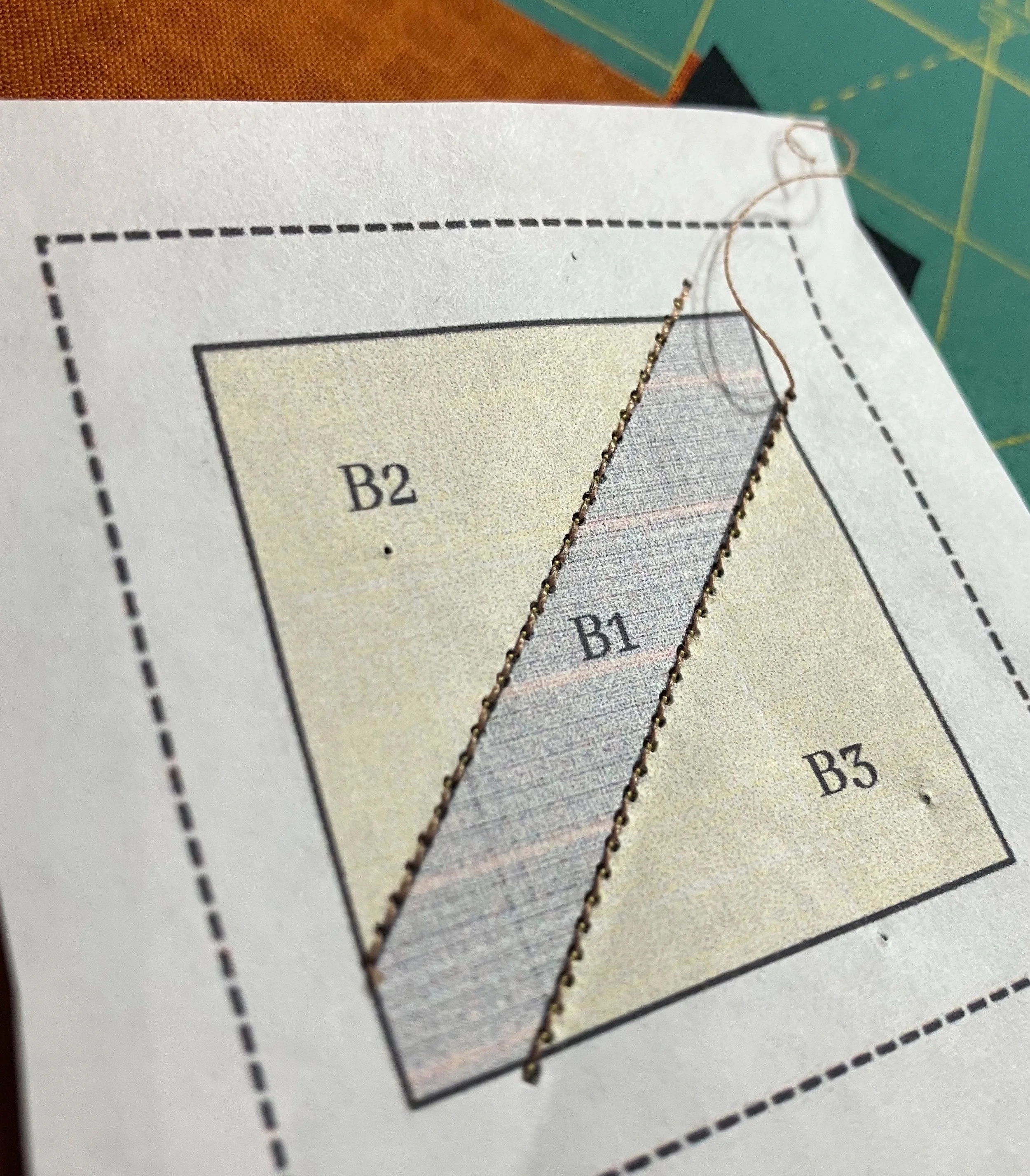 Starting with your paper template, place your eye fabric over section one in the center with the wrong side of the fabric against the wrong side of the paper. Make sure the fabric is extending past all of the lines by at least 1/4”. (Hold the paper and fabric up to a light source to help see through it to make sure the fabric is extending past the lines.) Place a pin in the fabric to hold it in place (make sure the pin is away from the line between piece one and two which is the first sewing line).