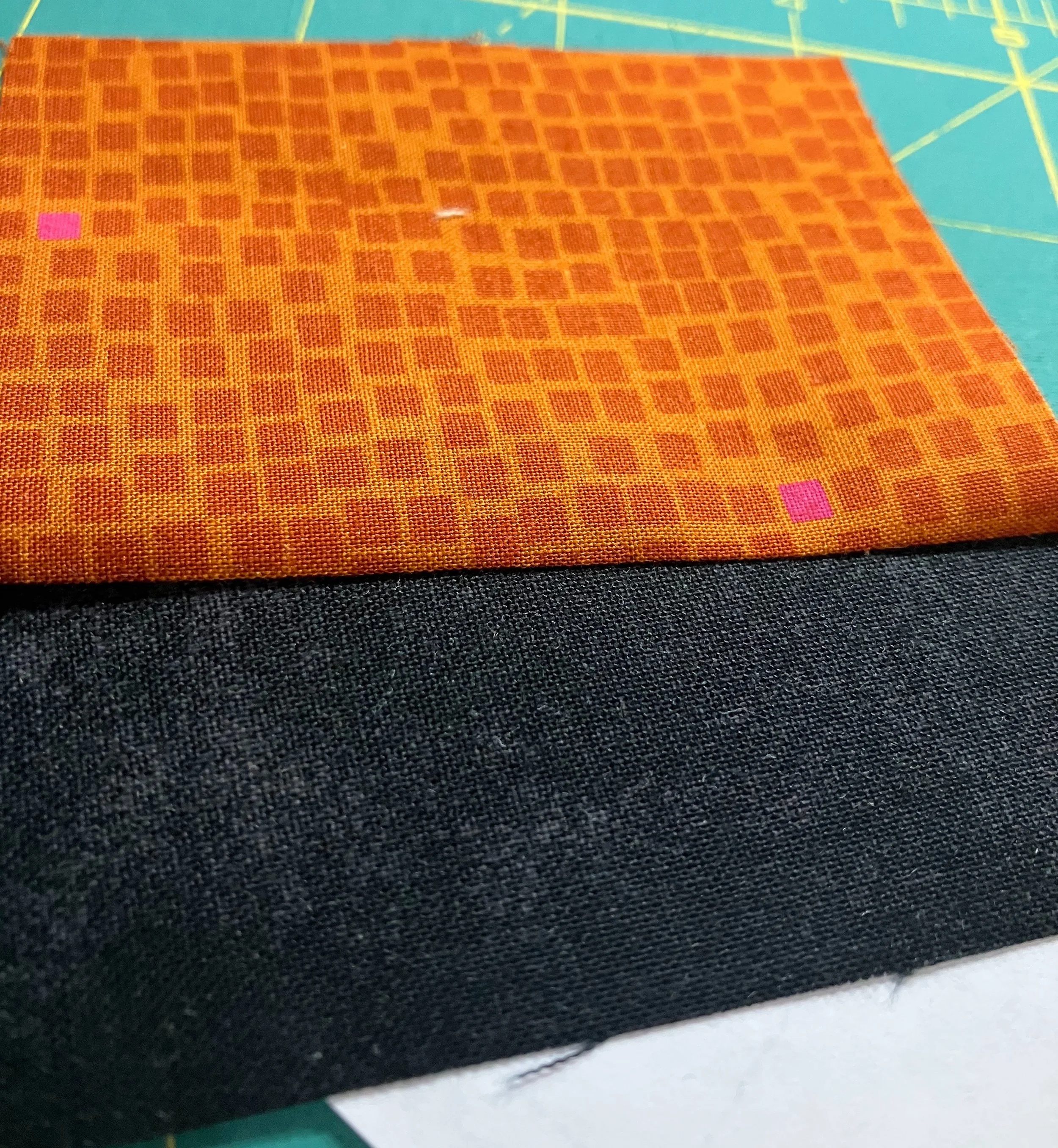 Unfold your paper, using the trimmed fabric as your guide, place your fabric for section two right sides together against the first fabric. Remove the pin holding the first fabric and press fabric two open.