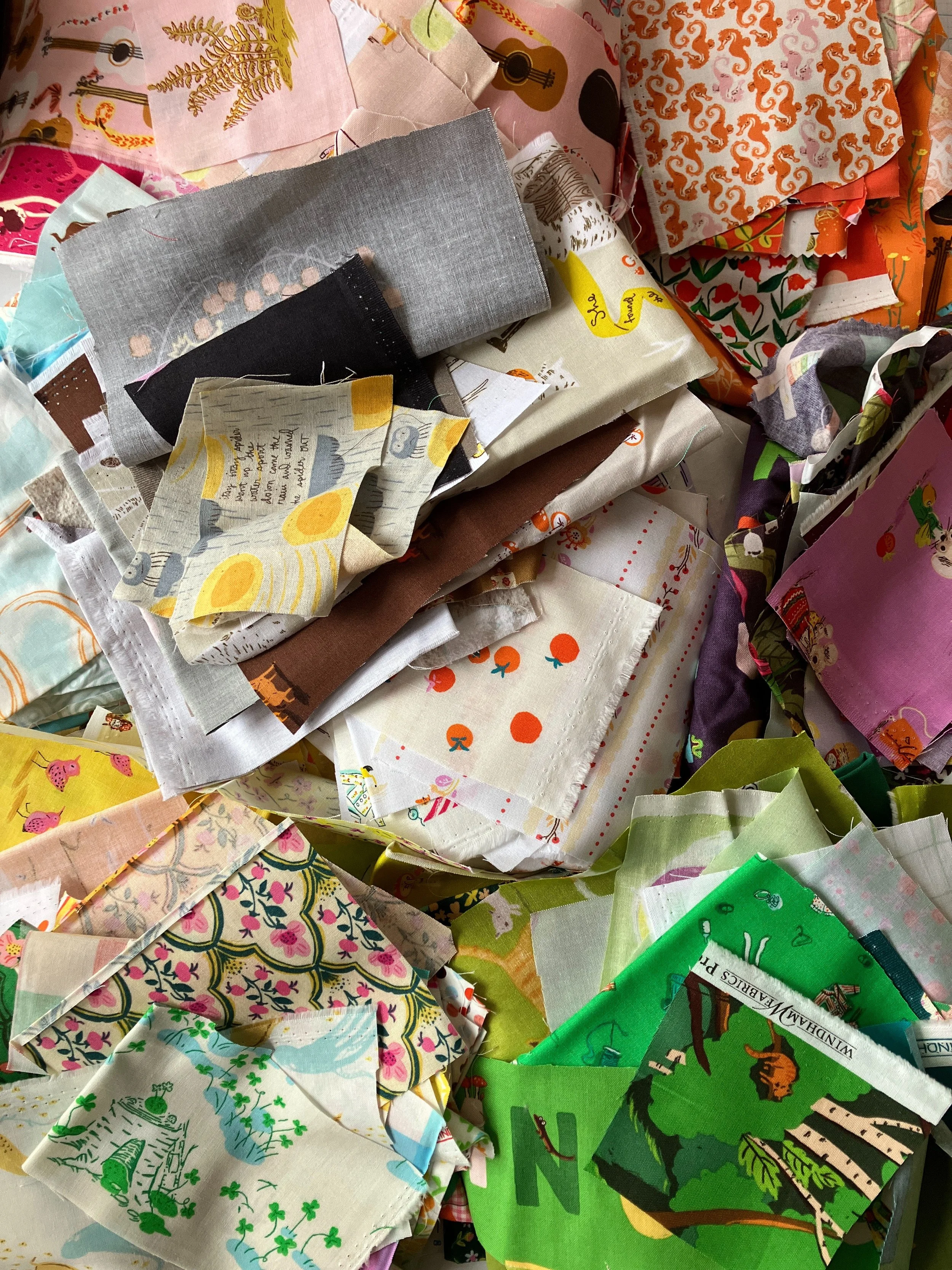 I did think about creating a true rainbow stripe across this quilt but it didn’t work well with the fabrics I have available. There’s a lot of blue waiting in my stash so I needed those long center diagonals to use them up. So I decided to split the quilt into a cool side and a warm side. I kept glancing at my scrap piles while I was mocking this up to get a good idea of what colors I was going to be pulling out: