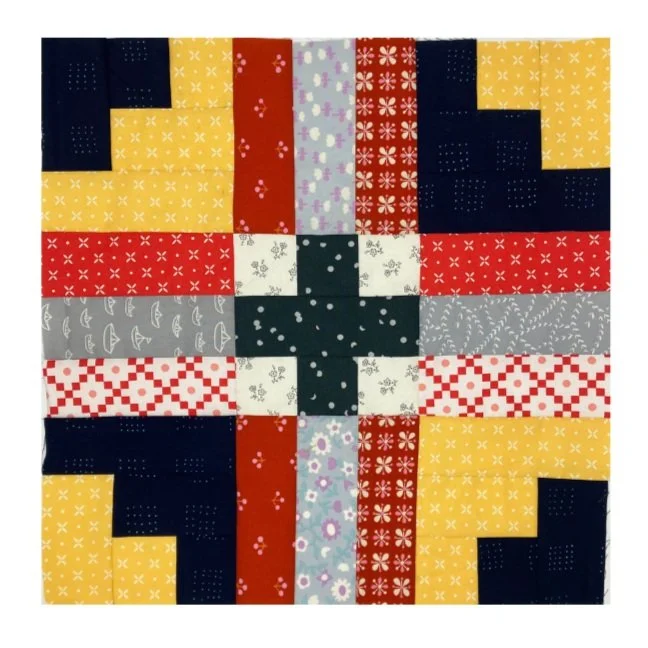 This block is still pretty organized. It could be made scrappier by mixing different yellows and navy in the corners.